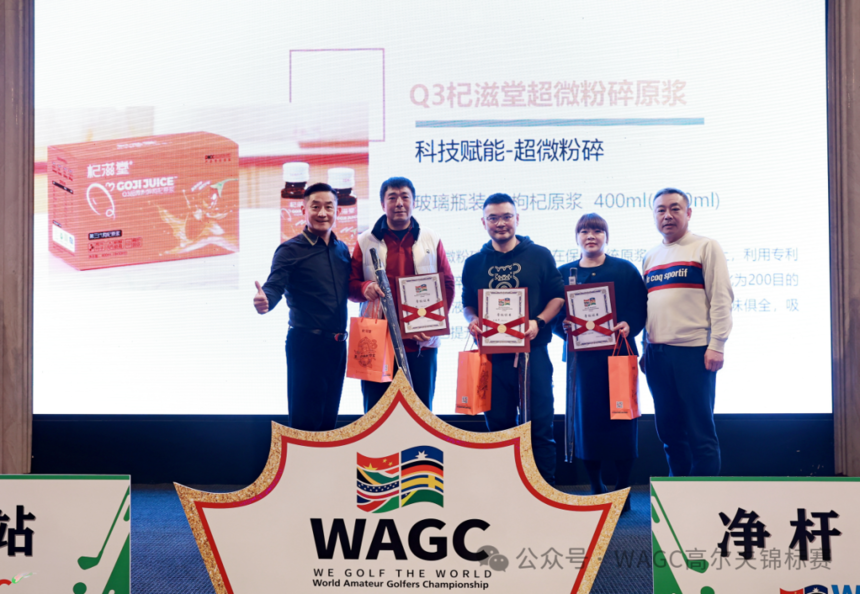 总杆冠军: 严永强 WAGC一直坚持以“体育,促进友谊和商机”为办赛宗旨。源于高尔夫,不止于高尔夫。来自各行各界的参赛球员嘉宾,在比赛的进程中和赛前赛后,充分交流,共话商机。本次上海站比赛,获得了众多企业品牌的鼎力赞助支持,众多企业品牌为比赛站台,为参赛球友、嘉宾带来了丰厚的奖项和礼品。 上海宏优贸易有限公司提供的人头马洋酒、葡萄淘提供的黑男爵*圣瑟曦*红葡萄酒、上海兰花醉酒业有限公司和上海守天下酒业提供酒宴用酒、上海悦十分实业发展有限公司(高尔夫雪茄套组)铁马高尔夫(高尔夫手拎包)、均瑶集团(益生菌大礼包)、PGM高尔夫用具、杞滋堂(宁夏)健康产业有限公司(杞滋堂枸杞原浆) 、福玉集团(有机玉米)等赞助企业为参赛球友、嘉宾带来了丰厚的奖项和礼品。特别值得一提的是,上市企业-均瑶健康(股票代码605388)和福玉集团自2023赛季一直作为赛事的全程赞助单位,一直在为每站比赛赞助提供球员伴手礼和比赛奖品。 |
