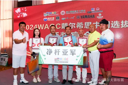 南山国际高尔夫球会总经理吕玉峰先生上台致开幕词,为晚宴拉开了帷幕。他对比赛的圆满落幕表示祝贺,并表达了对高尔夫赛事的参与者的崇高敬意。晚宴上,参与者们共同回顾了选拔赛的精彩瞬间,随后,2024WAGC戴尔希斯中国选拔赛-烟台站的冠 、亚 、季奖项分别揭晓。他们的卓越表现赢得了众人喝彩,颁奖仪式现场氛围热烈。 由烟台宝妈燕坊燕窝总经理 沈剑铷 女士 、茅台股份高尔夫酒 市场部经理 王子旭先生颁发净杆季军 由中国区秘书长 苏通先生 、WAGC 中国区秘书长陈亮先生 、WAGC赛事法律顾问 田野先生颁发净杆亚军 由WAGC中国执行主席李铁燹先生、南山国际高尔夫球会总经理曲涛先生颁发净杆冠军 2024WAGC戴尔希斯中国选拔赛 -烟台站晋级合影 2024WAGC烟台站 晋级名单如下: 差点组别-净杆冠军 净杆冠军A组:空缺; 净杆冠军B组:王泽福 净杆冠军C组:李金生 净杆冠军D组:吴明强 净杆冠军E组:邹俊涛